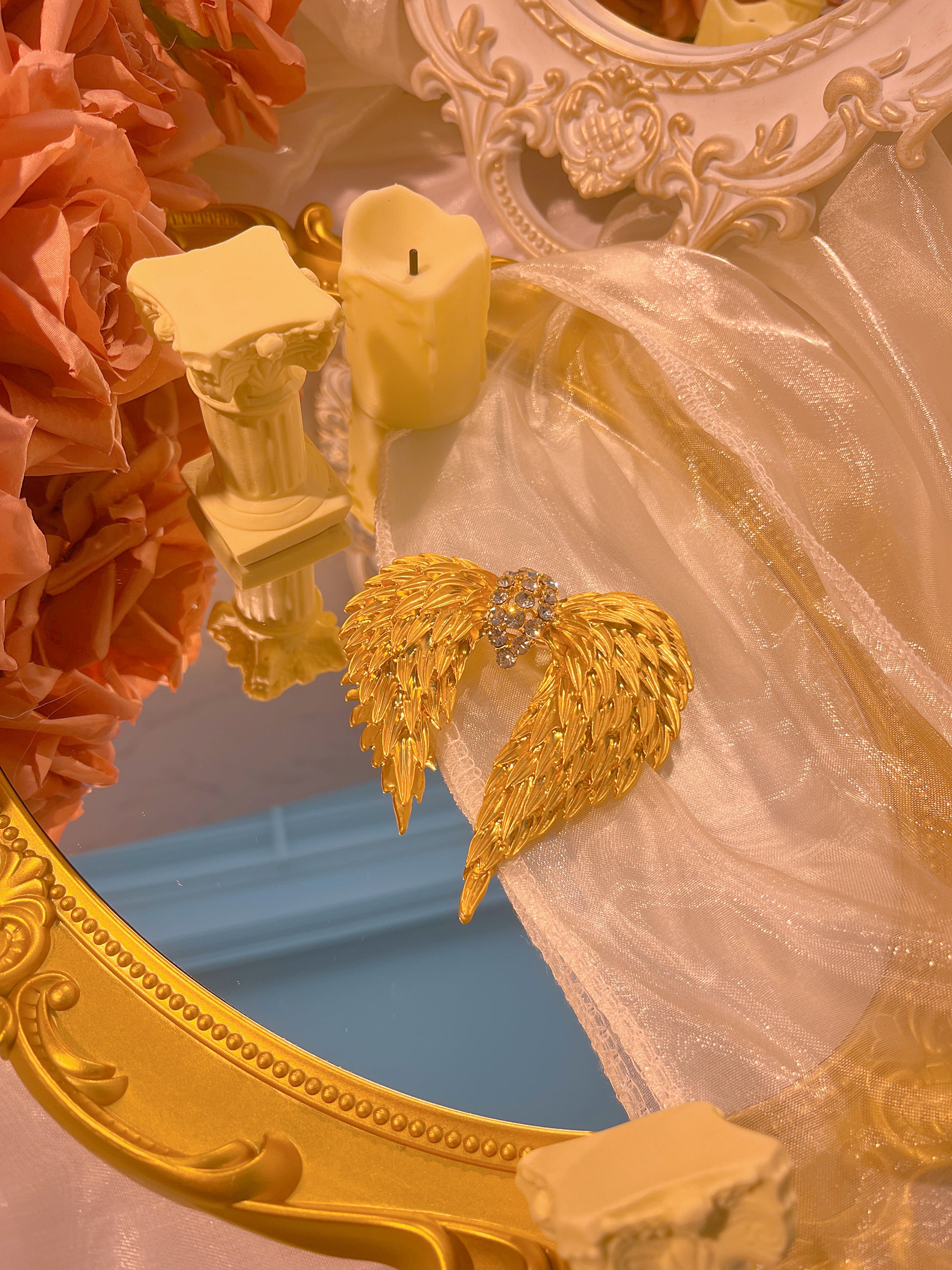 This exquisite brooch is designed in the shape of angel wings, rendered in a luxurious gold tone that exudes elegance and sophistication. The wings are intricately detailed with layered, feather-like engravings, creating a textured and realistic appearance that captures the light beautifully.