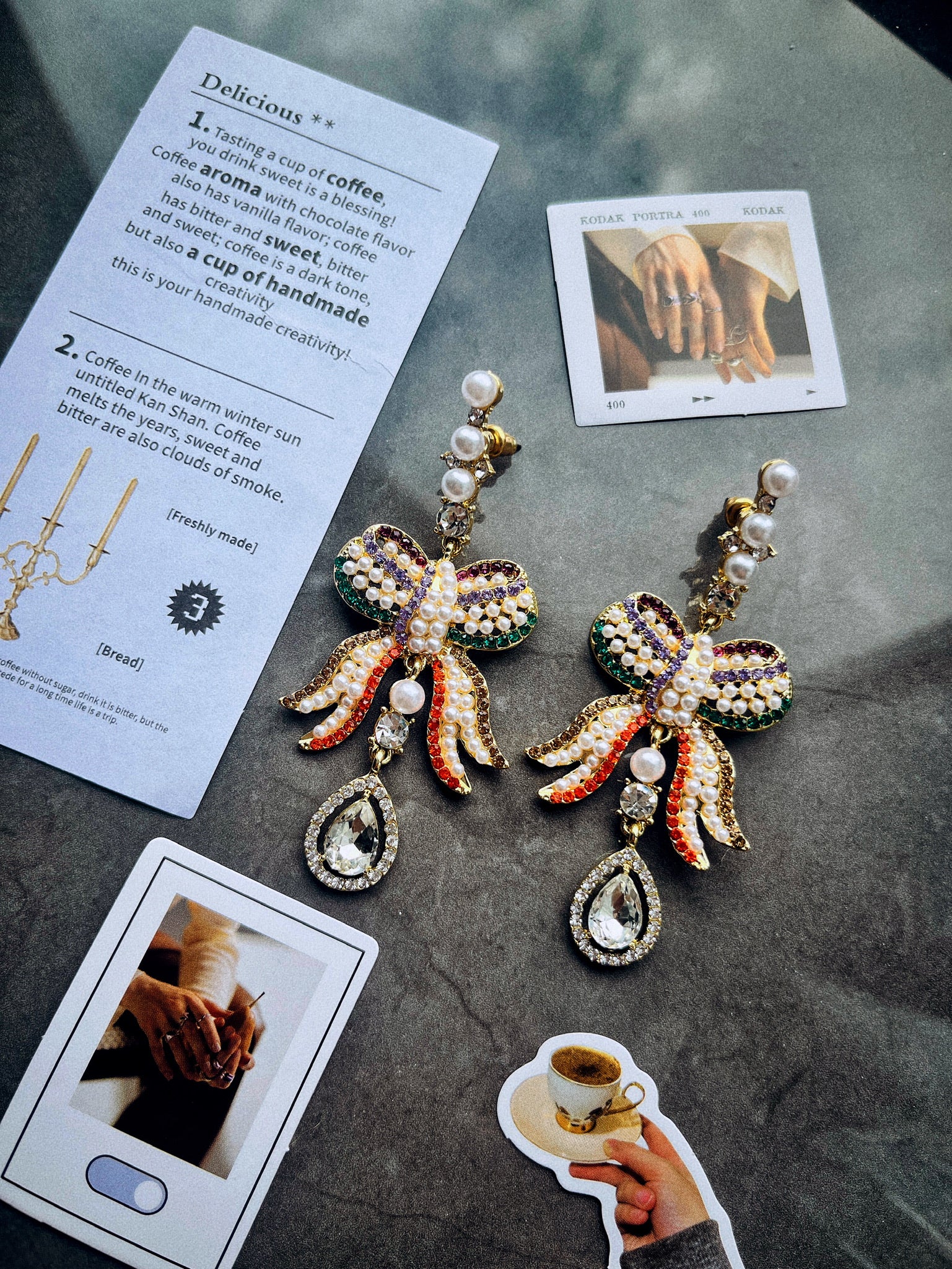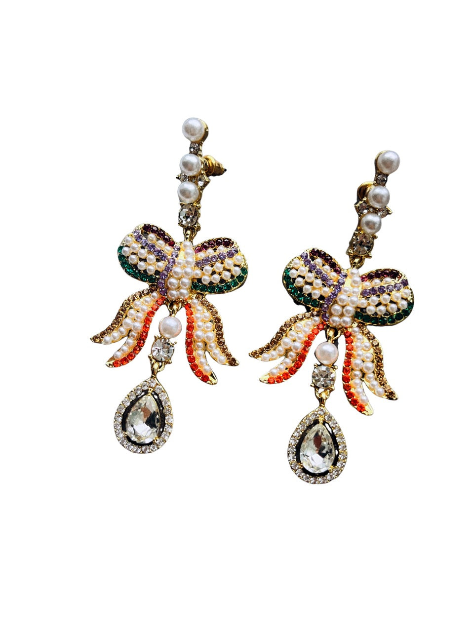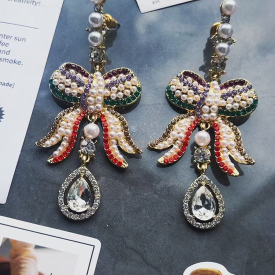 These stunning earrings are designed in the shape of intricate bows, adorned with a mix of vibrant colors and sparkling embellishments. The bows are decorated with rows of small, luminous pearls, while colorful crystals in shades of purple, green, orange, and gold create a striking, eye-catching pattern. Each earring features cascading ribbons of the same vibrant crystals, adding a playful yet elegant touch.