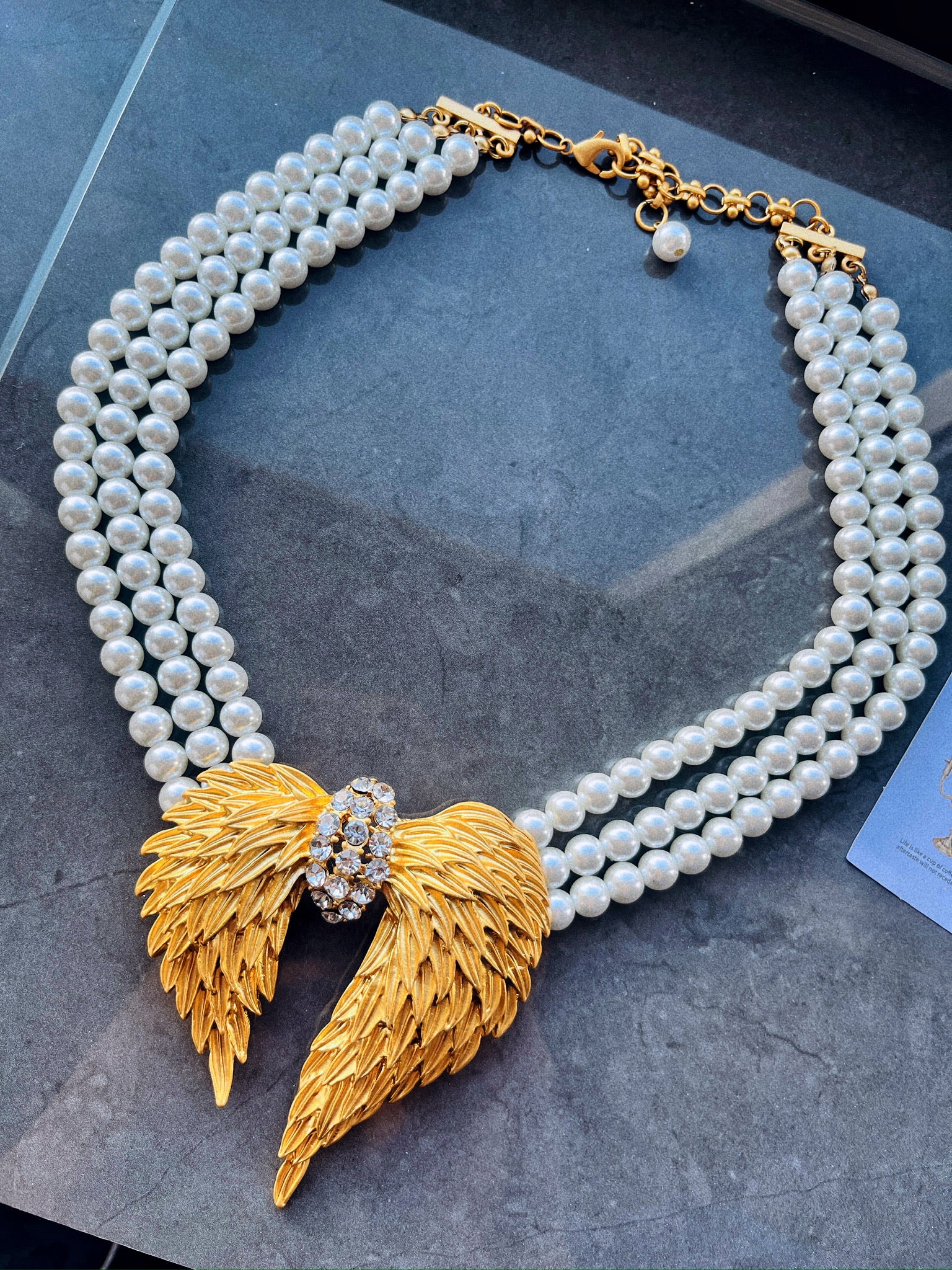 This necklace is a testament to classic beauty with a touch of whimsy. The three strands of pearls create a luxurious cascade, while the golden angel wing pendant, sparkling with crystals, adds a unique and eye-catching focal point. Lightweight and comfortable to wear, this necklace is designed to be the centerpiece of any outfit, whether you're dressing up for a gala or adding a touch of elegance to your everyday attire.