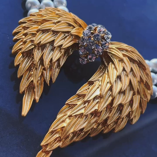 - Classic three-strand pearl design with a unique angel wing pendant, blending timeless elegance with ethereal charm.